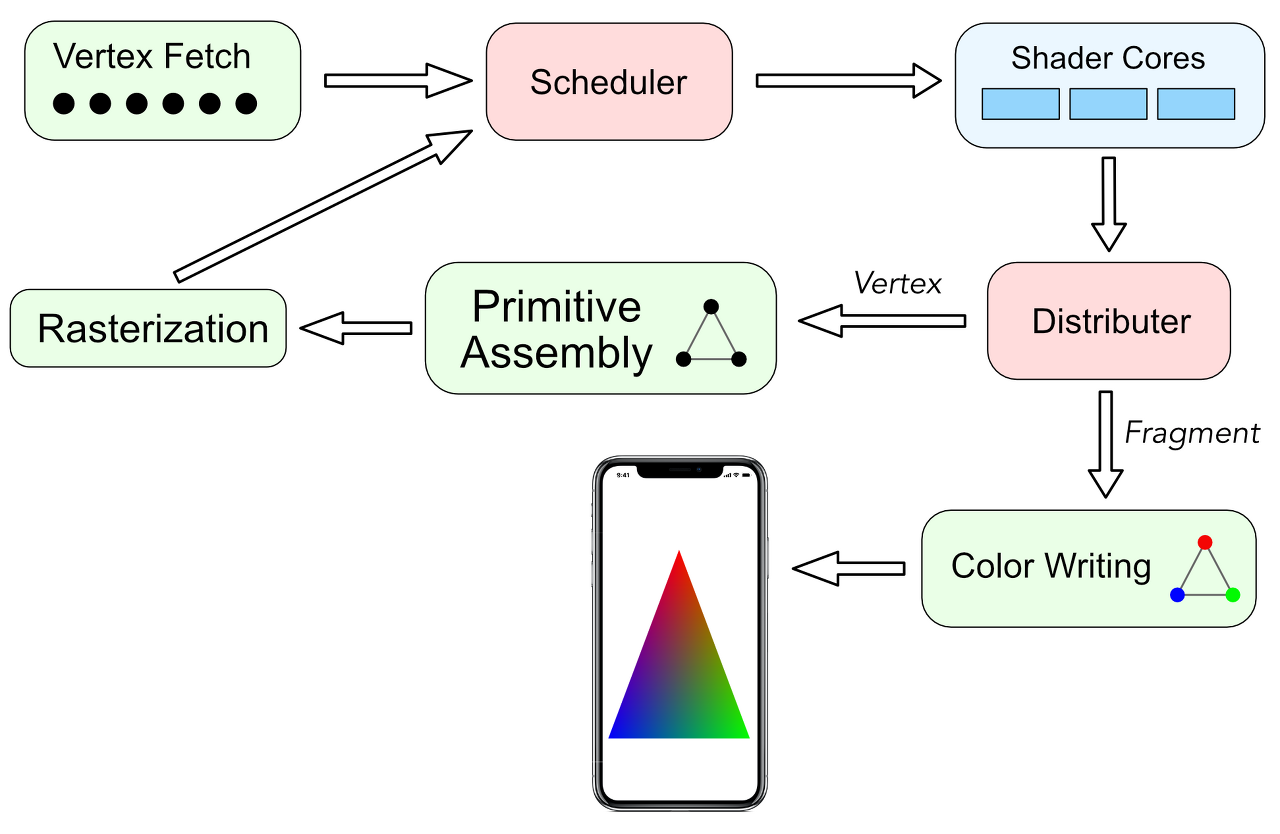 - Distributer가 작업에 따라 Vertex Processing을 수행시키고 Primitive Assembly -> Rasterization를 차례로 수행시키고 다시 Scheduler로 보낼 것인지, Fragment Processing을 수행하여 Color Writing을 할 것인지 정합니다.