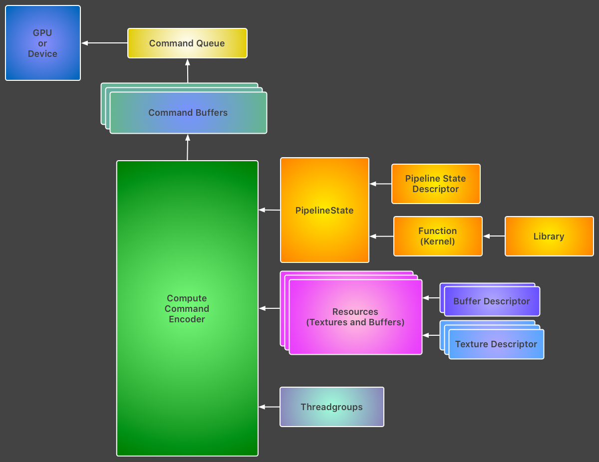여기서 하나의 MTLDevice, 하나의 MTLCommandQueue, 하나의 MTLLibrary 객체를 가지게 됩니다. 또한 다양한 파이프라인 상태를 정의하는 여러 MTLRenderPipelineState 개체와 데이터를 보관하는 여러 MTLBuffer가 존재하며, 파이프라인을 동작시키기 위해서는 이러한 객체들의 초기화를 위와 같이 수행해주어야만 합니다.