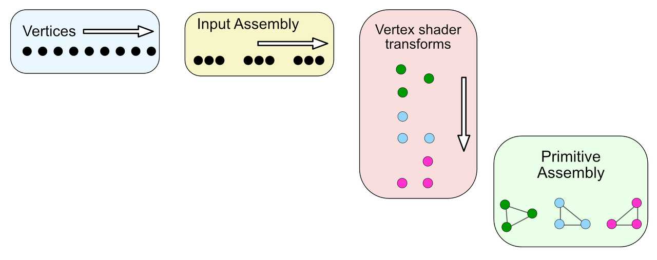 이전 단계에서는 데이터 블록으로 그룹화된 처리된 정점들이 현 단계를 거치게 되는데, 기억해야 할 중요한 점은 같은 기하학적 형태에 속하는 정점은 항상 같은 블록에 있어야 하는 것입니다. 즉, 점의 한 정점, 선의 두 정점, 삼각형의 세 정점은 항상 같은 블록에 있어야 합니다. 이때 가능한 기하학적 형태는, 점, 선, 삼각형이 존재하는데, 삼각형의 경우 정점이 시계 방향인지 반 시계인지에 따라서 면이 뒤를 향하는지 정면을 향하는지를 결정하게 되고,이에 따라 culling될 수도 있으며, 화면 범위를 벗어난다면 clipping됩니다.